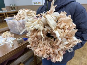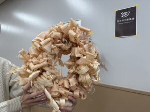 リースづくりは、事前申込制でしたが、満員御礼でした。鉋削りを体験してからの制作で、木の香りをかぎながらワイワイ作っていただきました。みなさん、初めてなのに上手!