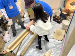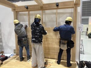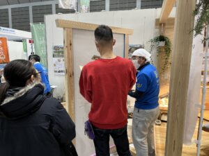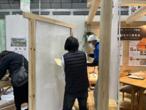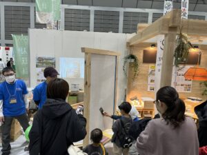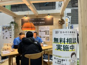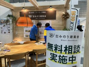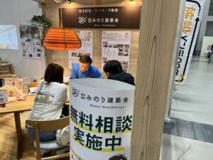 大規模なイベント出展はみのり建築舎としては初めてだったのですが、無事に終了できたことを嬉しく思います。相談ブースはみのり建築舎のよさが伝わるよう、大工さんたちに木組みをしてもらって床には普段使っている広葉樹を。