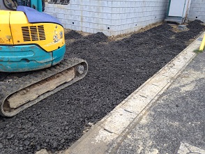 新設擁壁工事のための砕石を敷き固めて、