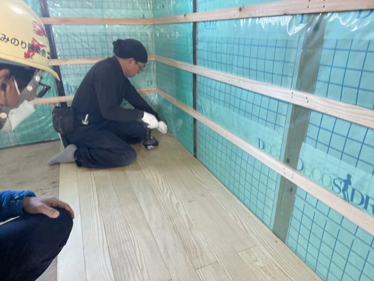 サクラ床のヘリンボーン貼り!