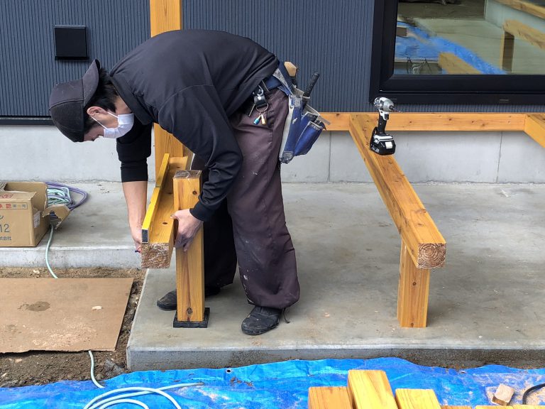 デッキ取り付け中の小野寺棟梁!