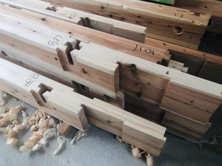 アカマツの梁刻み中!